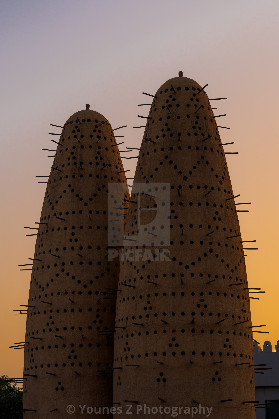 Traditional pigeon towers standing proudly in the heart of Doha, Qatar. These striking terracotta-colored structures are inspired by historic dovecotes once used across the Arabian Peninsula. Their cylindrical forms, covered in small openings and wooden perches, reflect authentic Qatari architectural heritage and sustainable design traditions.